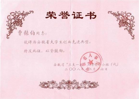 我公司執(zhí)行董事曹張伯被安徽省人事廳評為“安徽省大學(xué)生創(chuàng)業(yè)先進(jìn)典型”。
